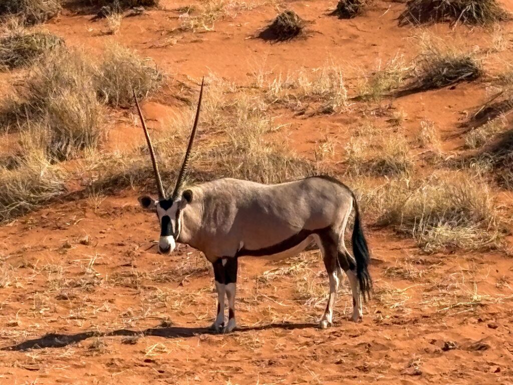 Der Nordzugang zu Wolwedans war einfach genial. Die rot-gelbe Sandlandschaft war spärlich mit kleinen tiefgrünen Bäumen durchsetzt und mit langgehörnten Oryx vervollständigt. Einfach überwältigend, diese natürliche Bildkomposition!